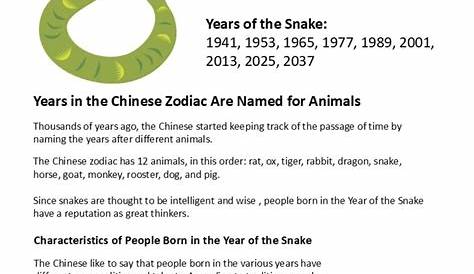Змея является шестым животным в китайской последовательности зодиака и связана с земным символом ветви ⁇ . Китайский год зодиака. Последние годы змеи включают 2013, 2001, 1989, 1977, 1965, 1953 и 1941, со следующим годом змеи в 2025 году (год древесной змеи). Люди, родившиеся в 1965 году, китайский год древесной змеи, спокойны и сложены, часто пытаясь собрать поощрения к действию от других.