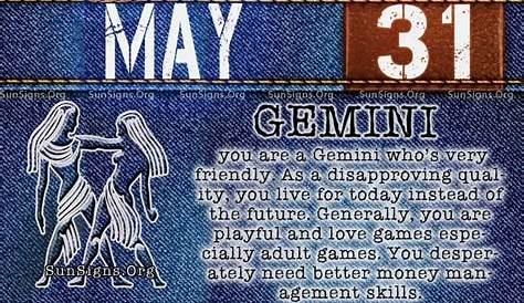 Если вы знаете свой восходящий знак, чтение для этого знака может дать дальнейшее понимание. Если ваш день рождения 31 мая, то вы — гемини, который очень решителен. Вы процветаете в социальных условиях, легко связываясь с другими. Читайте ежедневные гороскопы для вашего знака солнца или восходящего знака (потомка), чтобы спланировать свой день.