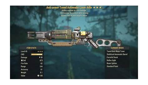 Для подробностей см. соответствующие статьи. Три звездных лазерных оружия, оказавших взрывной эффект, теперь являются двумя звездами. Если тип оружия = x, удалите легендарный эффект y, или, если тип оружия = x, и легендарный эффект = y, то изделие долговечность = 0. В последнем обновлении, которое было запущено 24 января, Bethesda удалила все осадки 76 взломанных и унаследованных видов оружия.