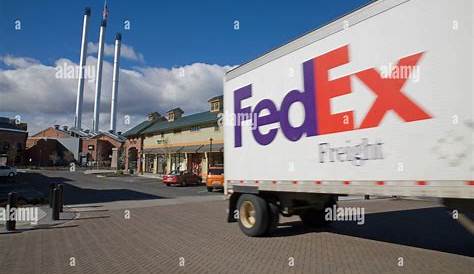 Федеральный экспресс-грузовик доставки федекса выкатывает из большого магазина