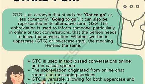 В этом руководстве вы узнаете. Он часто используется в качестве предлога для того, чтобы оставить чат или социальную встречу, и это. Но что это значит? Gtg, или должен пойти, это жаргонный термин, используемый людьми, которые слишком заняты или не заинтересованы в продолжении разговора.