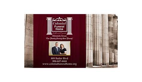 Наша семья поможет вашей семье. Потому что колониальное похоронное бюро — единственное в округе Кастро, принадлежащее местным жителям, и семейное похоронное бюро, все решения принимаются на местном уровне. Ниже вы найдете все похоронные бюро и кладбища в или рядом с Диммитом. Она будет помниться за ее непоколебимость.