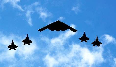 Бомбардировщик B2 возглавляет группу истребителей во время военного полета