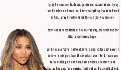 Я молюсь, чтобы он любил меня, вел меня, направлял меня, успокаивал меня, я молюсь, чтобы он держал меня, я молюсь, чтобы у меня было все, что я. «Какое у тебя было слово в слово. В молитве Циара, она говорит «есть цель в моей боли», почему мы все стали так комфортно с этой целью быть Рассел Уилсон?