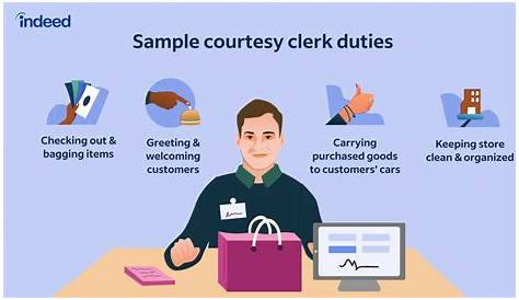 Основная обязанность человека, работающего в этой роли, — приветствовать клиентов и помогать им в поиске предметов в магазине. Куртизанки помогают клиентам и другим сотрудникам продуктового магазина с такими обязанностями, как упаковка продуктов, доставка тяжелых предметов в автомобили клиентов и хранение прилавков и. Пример описания работы клерка из вежливости Крогера.