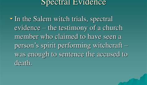 Такие показания часто давали во время судебных процессов над ведьмами. Обвинители, все молодые девушки, утверждали, что с ними заключили контракт некоторые жители Салема. Спектральные доказательства — это свидетельства, основанные на снах и видениях обвинителя. Спектральные доказательства — это доказательства, основанные на снах и видениях духа ведьмы или поступках призрака.