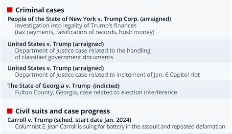 Уголовные дела Трампа включают обвинения, связанные с его действиями во время президентства, в частности, в отношении беспорядков 6 января в Капитолии.Эти юридические проблемы более серьезны, поскольку они могут привести к значительным наказаниям, если он будет признан виновным.