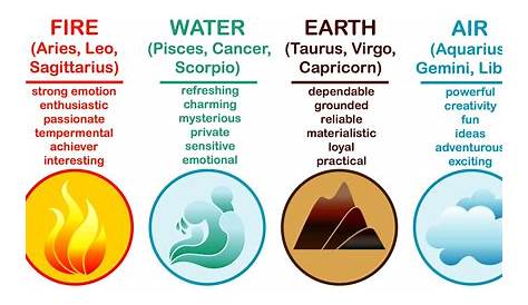 Огонь, земля, воздух и вода. Земные знаки являются обоснованными и практичными, воздушные знаки являются интеллектуальными и коммуникативными, огненные знаки являются страстными и энергичными, а водные знаки эмоциональными и интуитивными. Четыре элемента зодиака — огонь, земля, воздух и вода — каждый предлагает уникальное понимание личности и поведения. Понимая черты и личности, связанные с каждым элементом, вы.