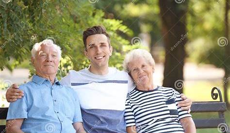Мужчина с пожилыми родителями на скамейке запасных Изображение поколения